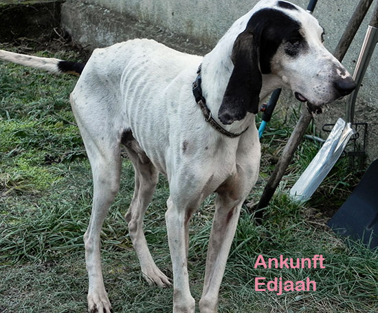 Edjaah, den alten Jagdhund, konnten wir dank Spenden für seinen Transport im Januar 2015 aus Süd-West-Frankreich retten. Nochmals vielen Dank dafür! Im Mai wurden seine Augen operiert, da er extreme Roll-Lider hatte. Edjaah hat sich inzwischen prächtig entwickelt. Als er ankam wog er 19,5 kg, konnte kaum stehen und laufen. Jetzt wiegt er bereits 25 kg und tobt gemeinsam mit den anderen Hunden herum, so sehr, dass er sich einen Zeh gebrochen hat.